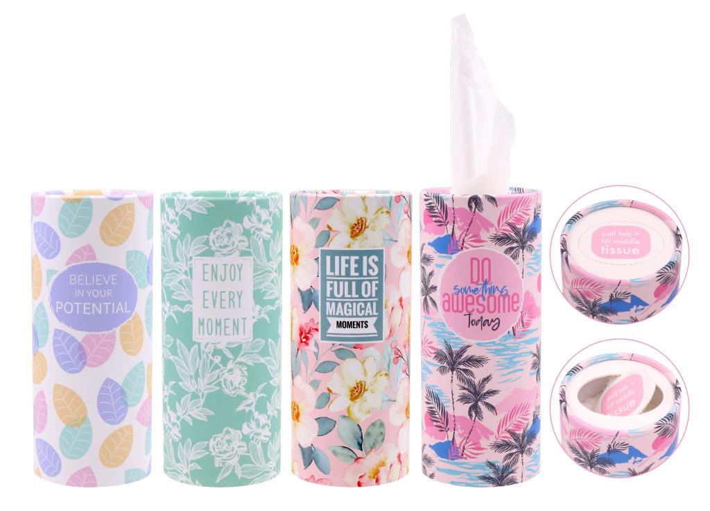 Keep tissues handy in style with the Decorative Cylinder Style Car Tissues – 50PK (Pastel Floral Series). Presented in a compact cylinder tube, these tissues are perfect for keeping in the car, on a desk, at reception, or in customer areas. The pastel floral designs add a clean, decorative look while staying practical for everyday use.
